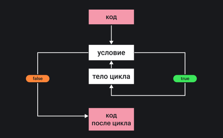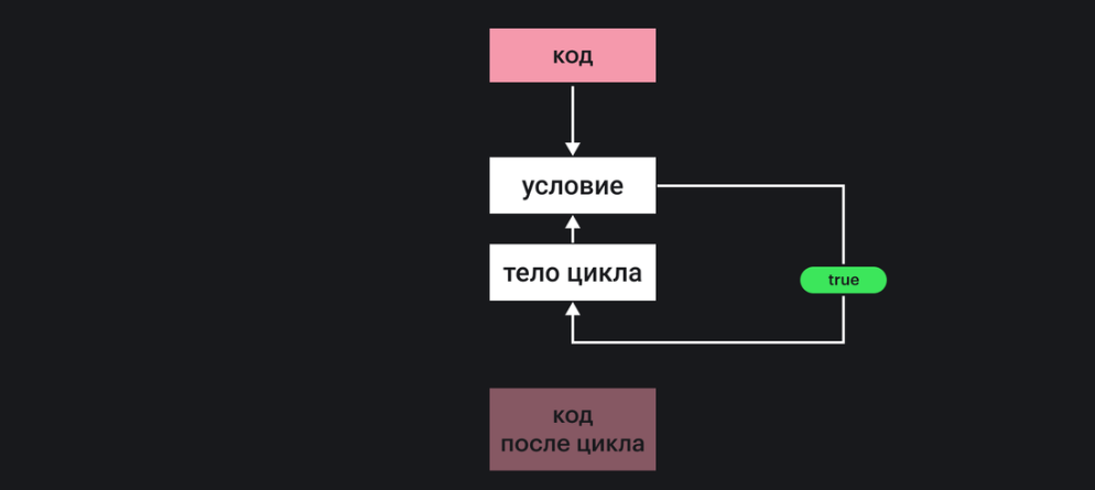 - Если условие выполняется, выполни тело цикла. Затем вернись в пункт 1.