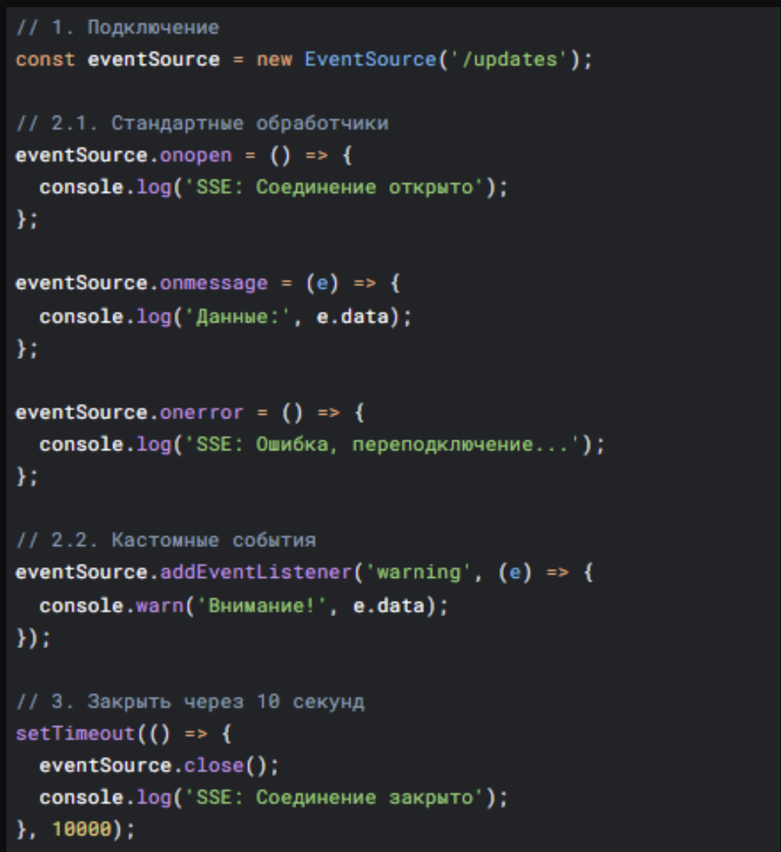 Также переподключение не произойдёт, если в ответе указан неверный Content-Type или его статус отличается от 301, 307, 200 и 204. Браузер создаст событие “error” и не будет восстанавливать соединение.